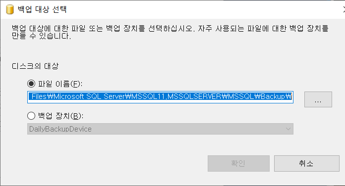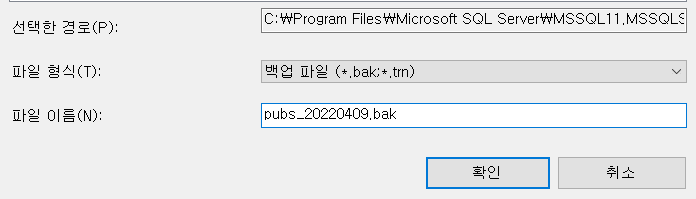4. 백업파일을 보관할 경로, 백업파일 이름을 지정한 후 확인버튼을 누른다.