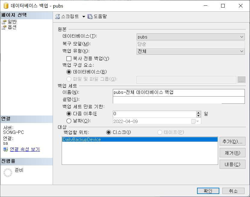 ※대상에는 복수로 추가가 가능, 이 경우에 사이즈가 큰 데이터베이스를 하나의 백업파일이 아닌 복수개로 나눠서 분할백업을 할 경우 추가하면 됨.