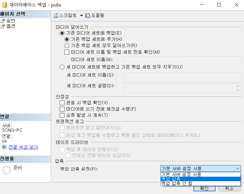 5. 옵션탭에서 기존 백업파일을 덮어쓸것인지, 압축을 할 것인지 선택할 수있다.
